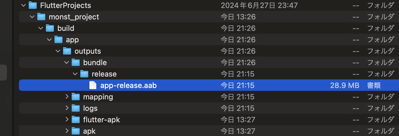 作成される場所 <プロジェクトルート>/build/app/outputs/bundle/release/app-release.aab