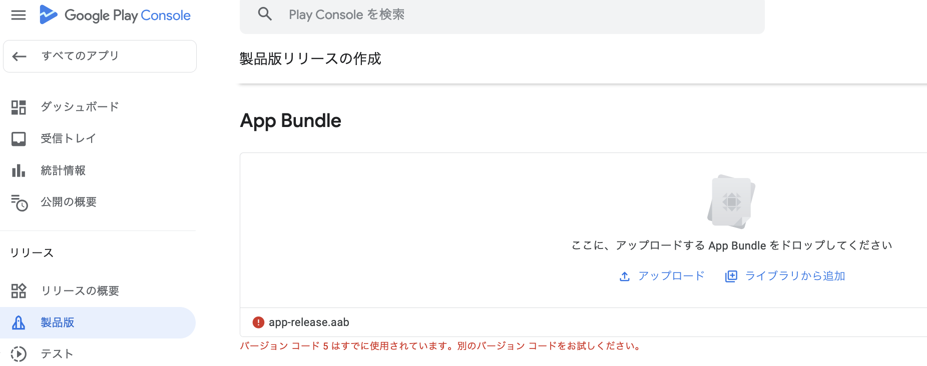 前回と今回のバージョンが違っていてもGooglePlayConsoleのAABファイルの判定は+5の部分で行なっており、こちらを1ずつ追加していく必要があります。